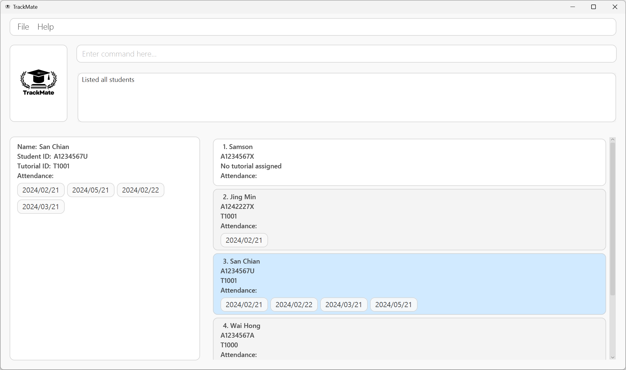 TrackMate is a desktop application for managing your contact details. While it has a GUI, most of the user interactions happen using a CLI (Command Line Interface).