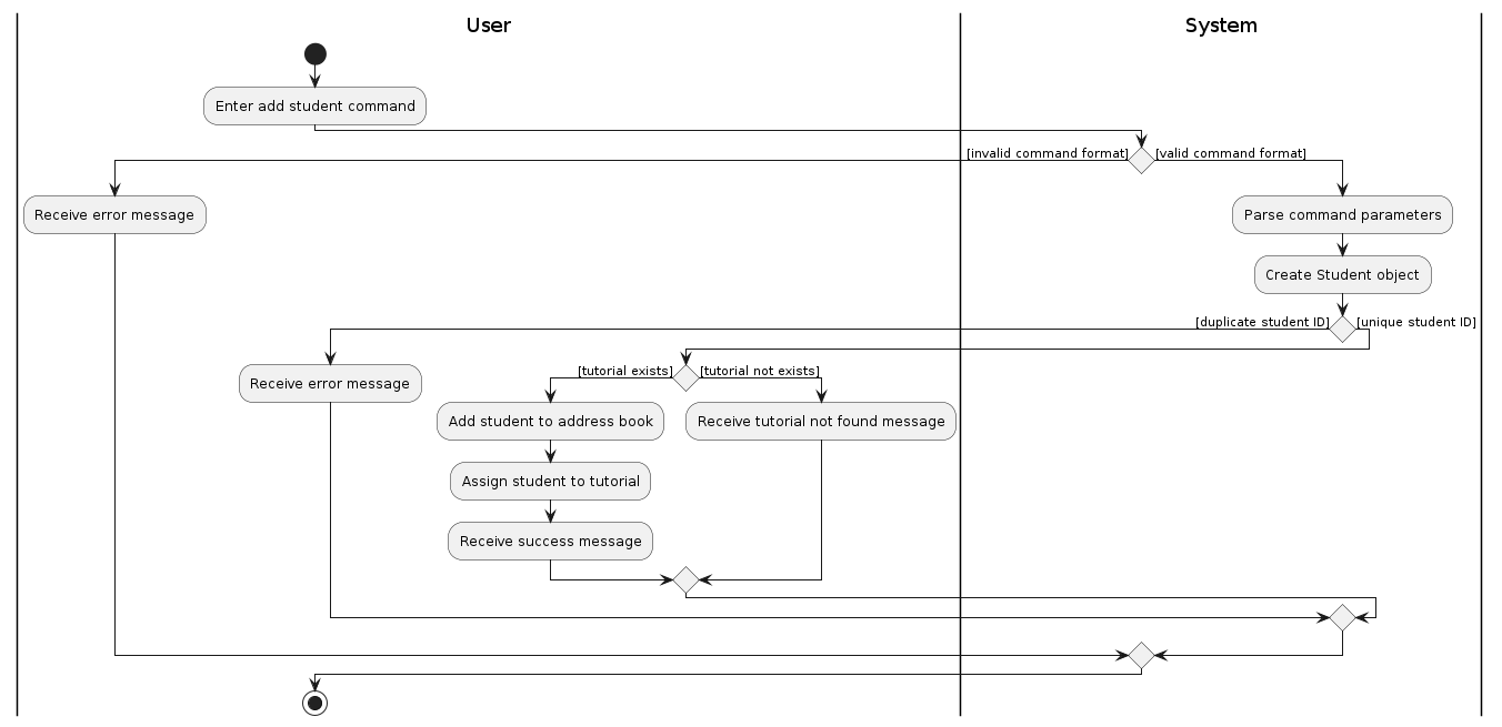 TutorialList and Student) to ensure consistency without impacting performance.To ensure data integrity and completeness, the system necessitates the inclusion of parameters such as Name and Student ID. The activity diagram below shows the sequence of action users will have to take to add a new Student Profile into the TrackMate Application.
