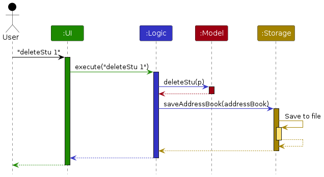 The Sequence Diagram below shows how the components interact with each other for the scenario where the user issues the command deleteStu 1.
