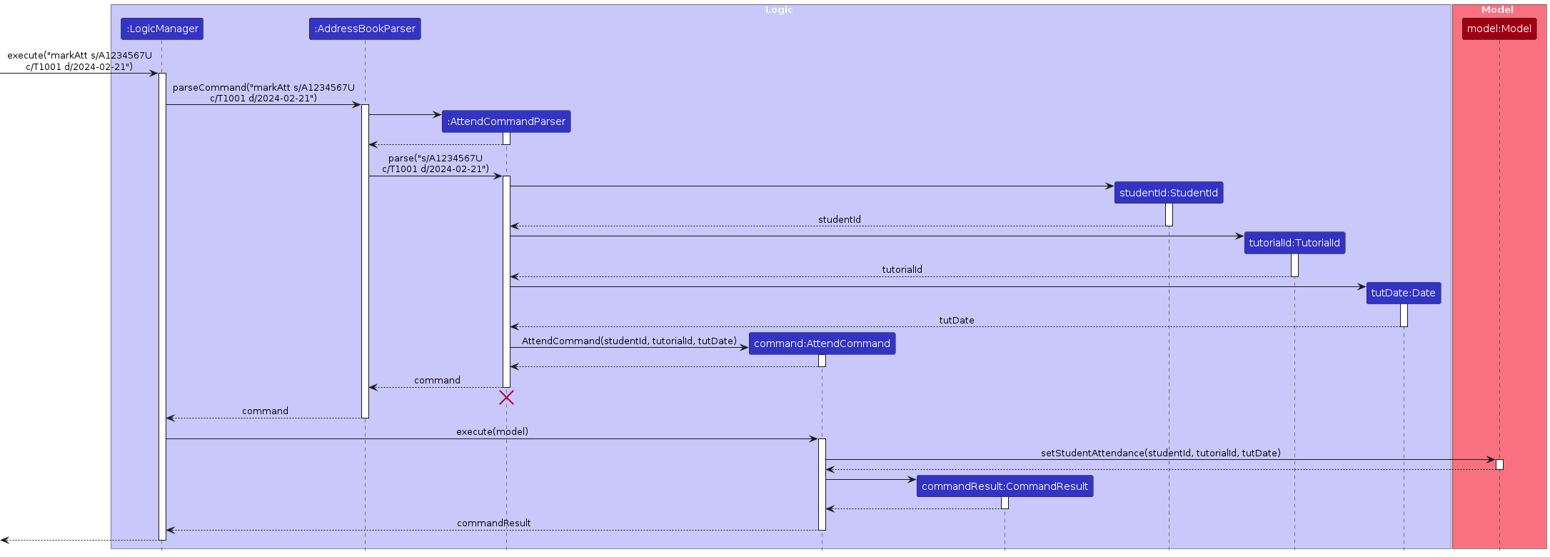 The AttendCommand is responsible for marking the attendance of a student for a specific tutorial session in the TrackMate Application. This command interacts with the model to update the attendance record of a given student for a particular tutorial. The sequence diagram below shows how the command interact with other classes.