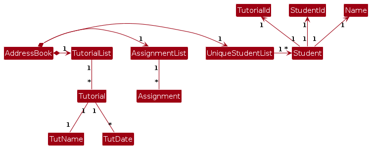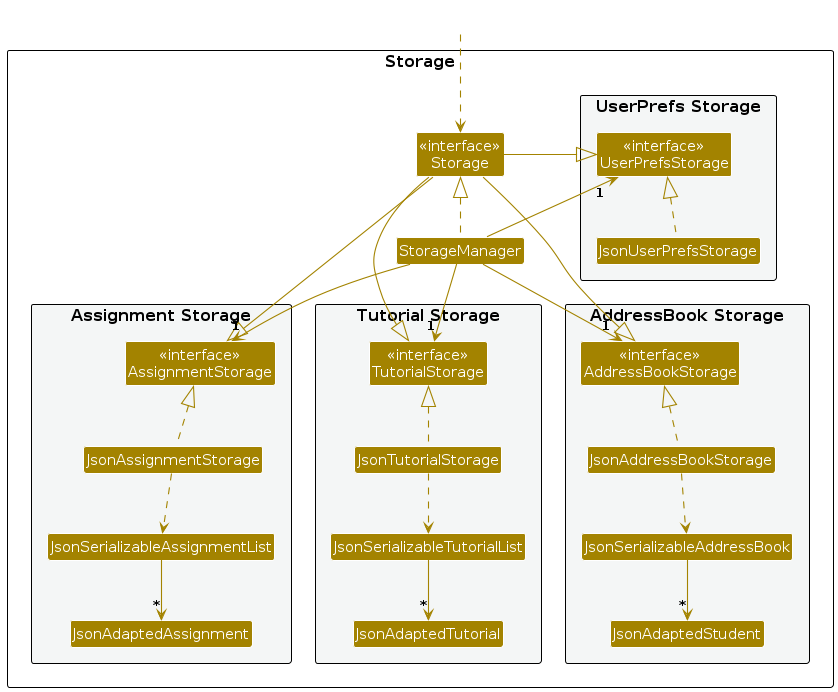 AddressBookStorage, UserPrefStorage, TutorialStorage and AssignmentStorage, which means it can be treated as one of these (if only the functionality of only one is needed).Model component (because the Storage component's job is to save/retrieve objects that belong to the Model)Classes used by multiple components are in the seedu.address.commons package.