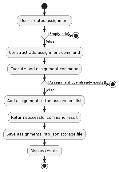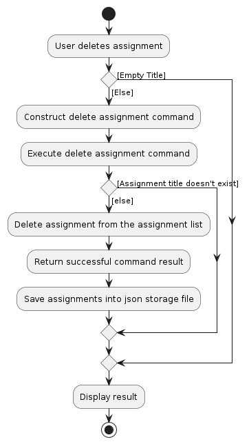 To delete an assignment, the user specifies the assignment title. The system ensures that the assignment exists before deleting it from the model. The activity diagram below illustrates what the series of actions the user should do to delete assignment.