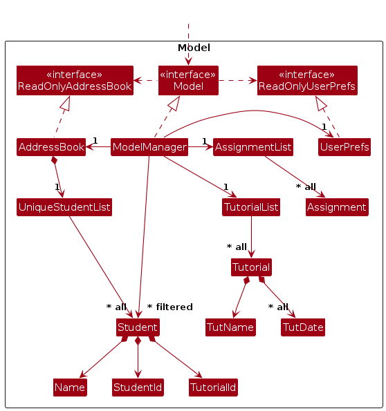 Student objects (which are contained in a UniqueStudentList object).Student objects (e.g., results of a search query) as a separate filtered list which is exposed to outsiders as an unmodifiable ObservableList<Student> that can be 'observed' e.g. the UI can be bound to this list so that the UI automatically updates when the data in the list change.UserPref object that represents the user’s preferences. This is exposed to the outside as a ReadOnlyUserPref objects.Model represents data entities of the domain, they should make sense on their own without depending on other components)Note: An alternative (arguably, a more OOP) model is given below. This model introduces a more streamlined structure where AddressBook holds a TutorialList and an AssignmentList, linking directly to Tutorial and Assignment entities. Each Student is associated with a TutorialId, and Tutorial entities maintain a list of Student objects, making it easier to manage relationships and reducing redundancy. This design allows AddressBook to manage tutorials and assignments without requiring each student to hold separate Tutorial or Assignment objects, simplifying interactions and data management.