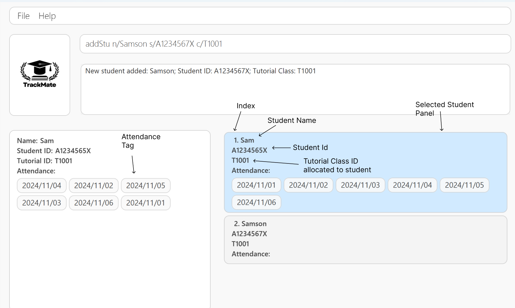 addStucommand afterfindcommand will return the full list of students in TrackMate application.- Since this application is catered to only one module, each student can only be assigned to one tutorial.