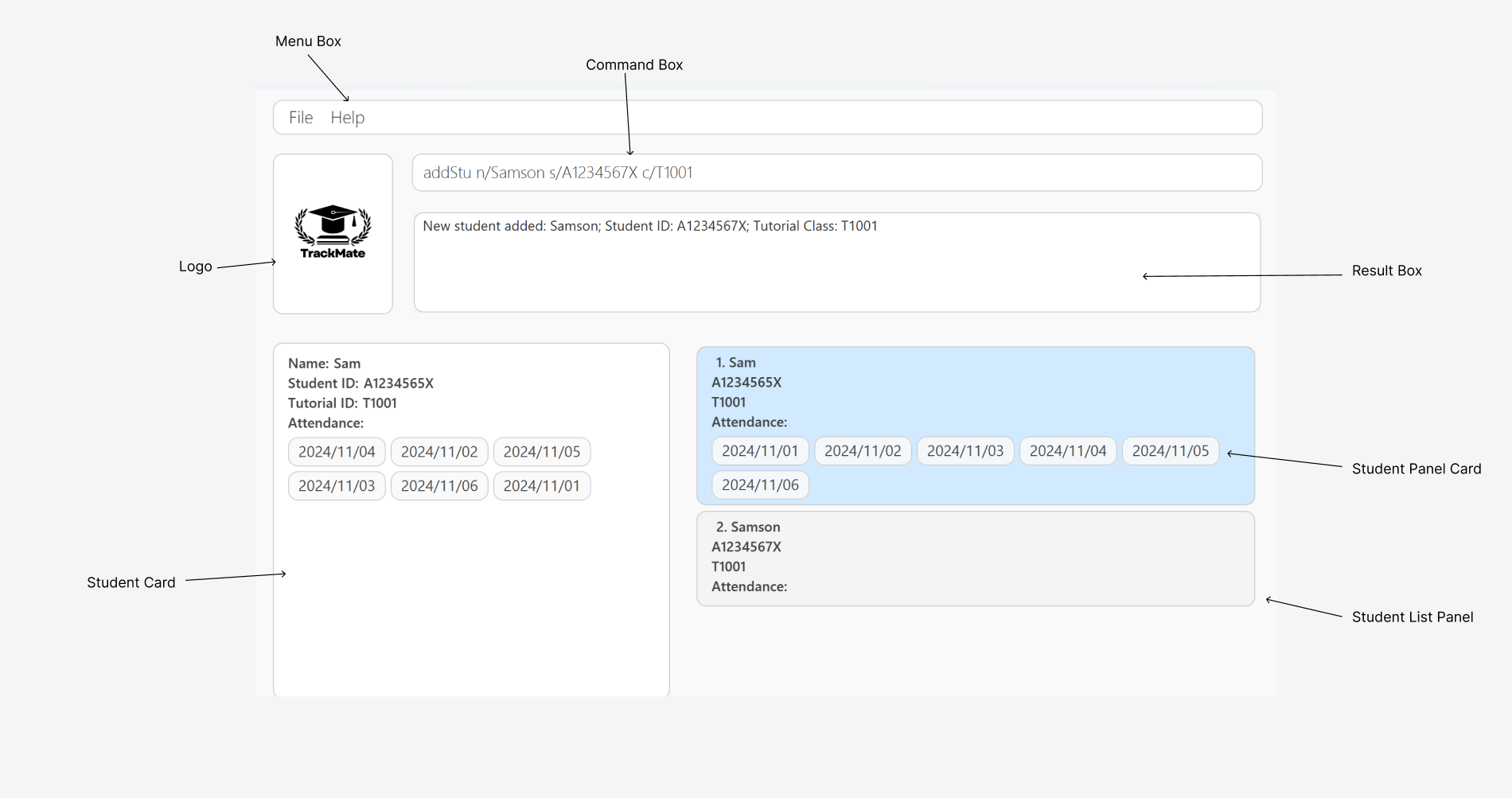 date 2024-01-24.list : Lists all student details.clear : Clears all data from TrackMate.exit : Exits the app.The designated names for each component of the User Interface will be used consistently throughout the User Guide to ensure clarity and minimize confusion. Below is a detailed description of each component.